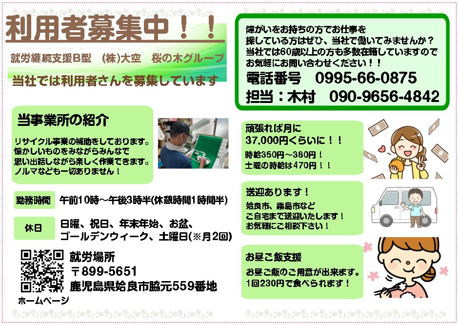 姶良市の就労継続支援B型では高水準の「時給330円~」となります。